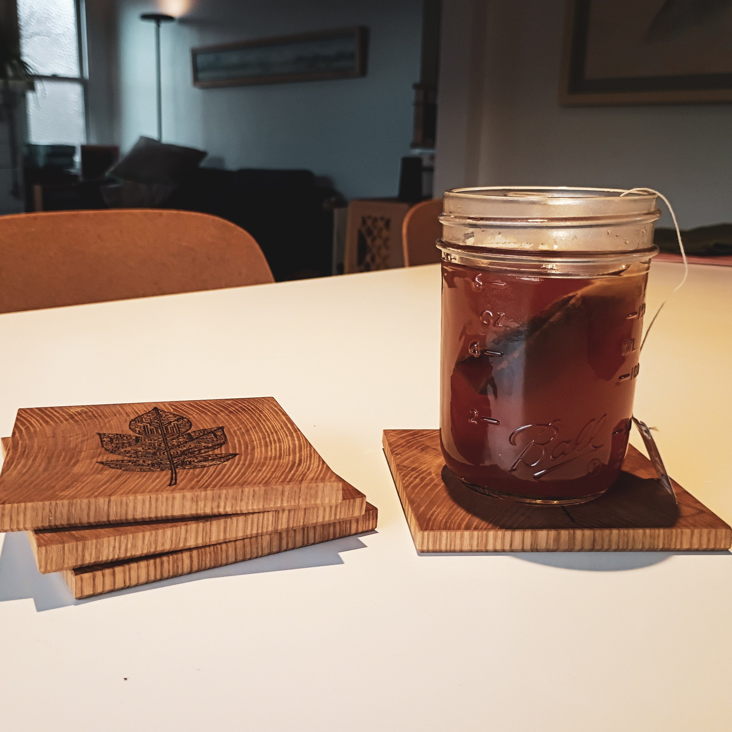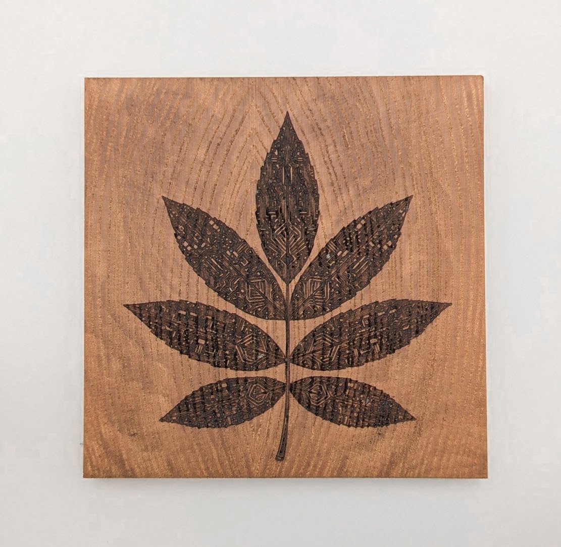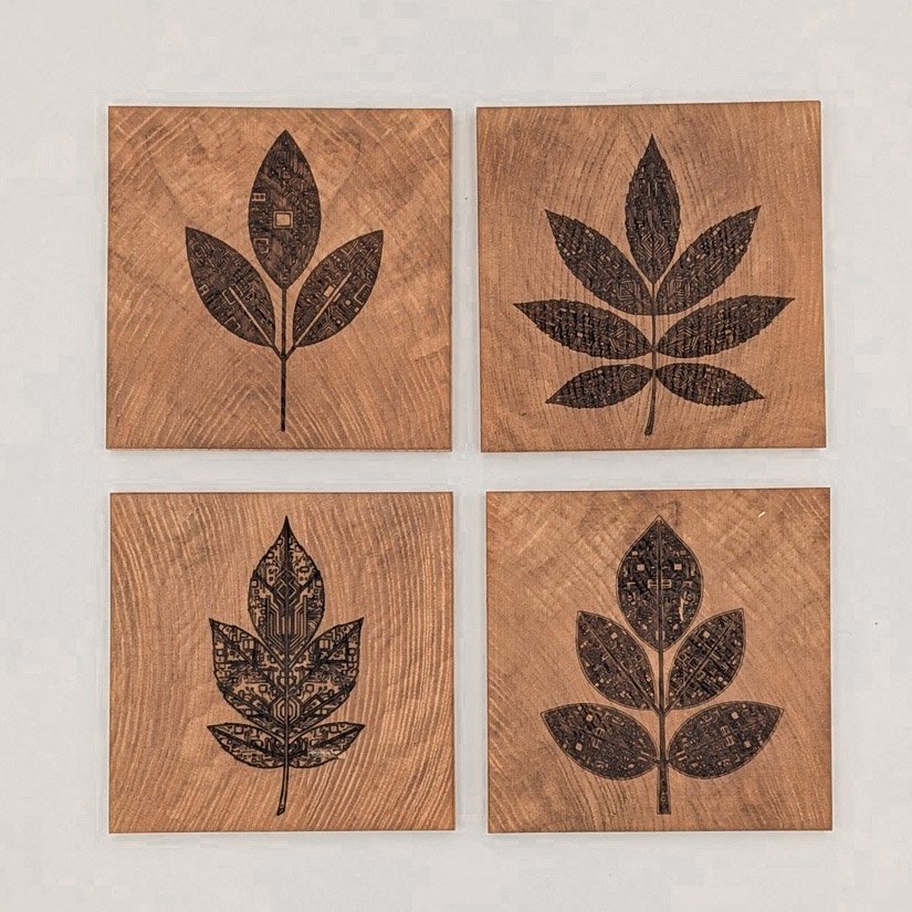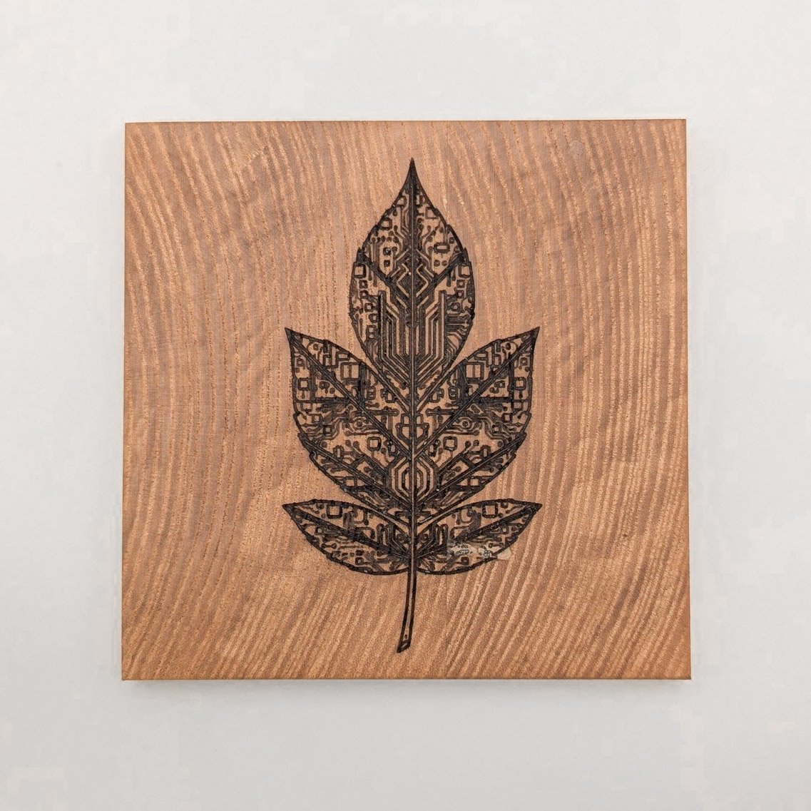 Where do the veins end and the wires begin? Ash wood with bold grain lines serves as the perfect backdrop for this electronic schematic design. Explores the symmetry between biological and electronic systems. Durable, hand-finished 100mm coasters with traditional Japanese finish. Shipping included.