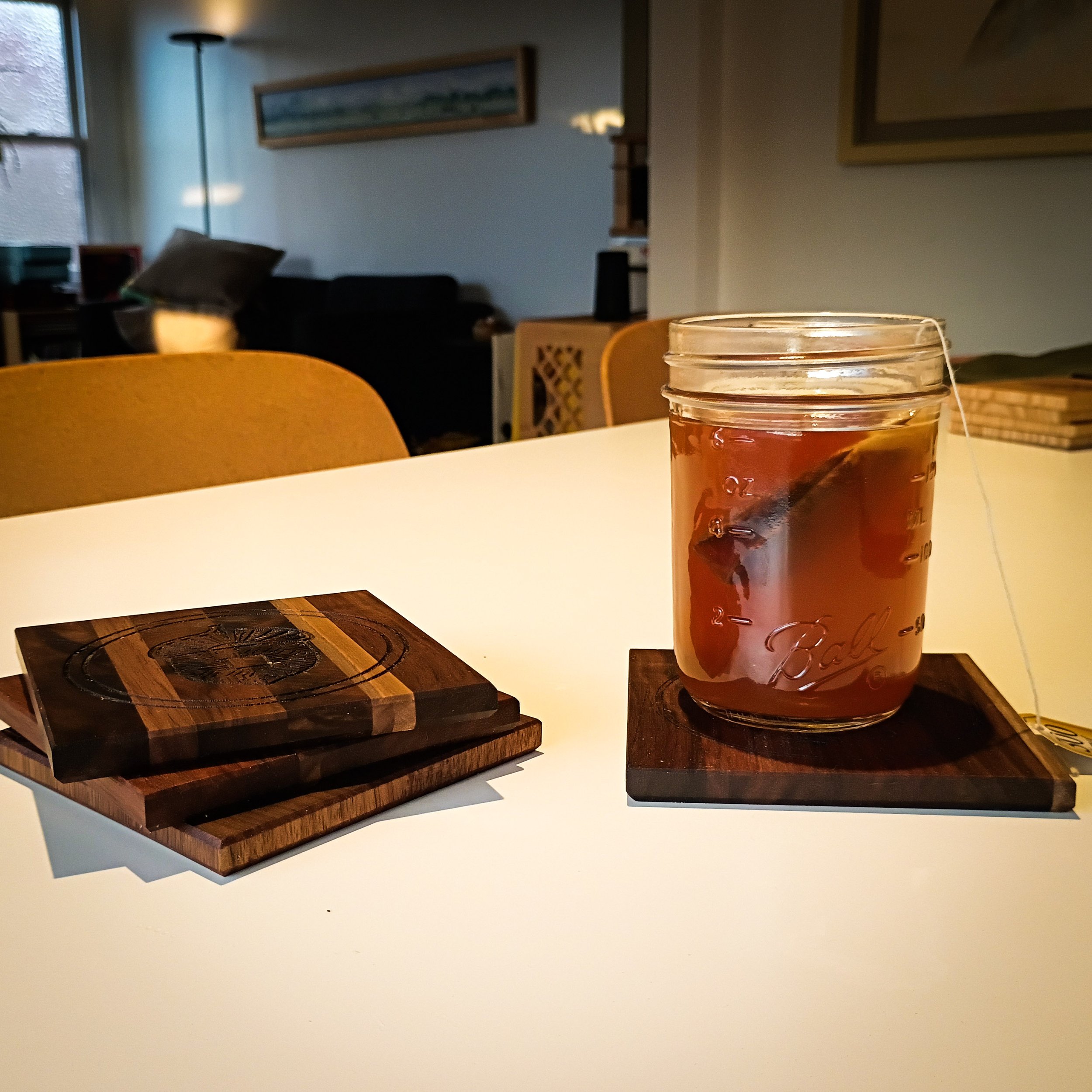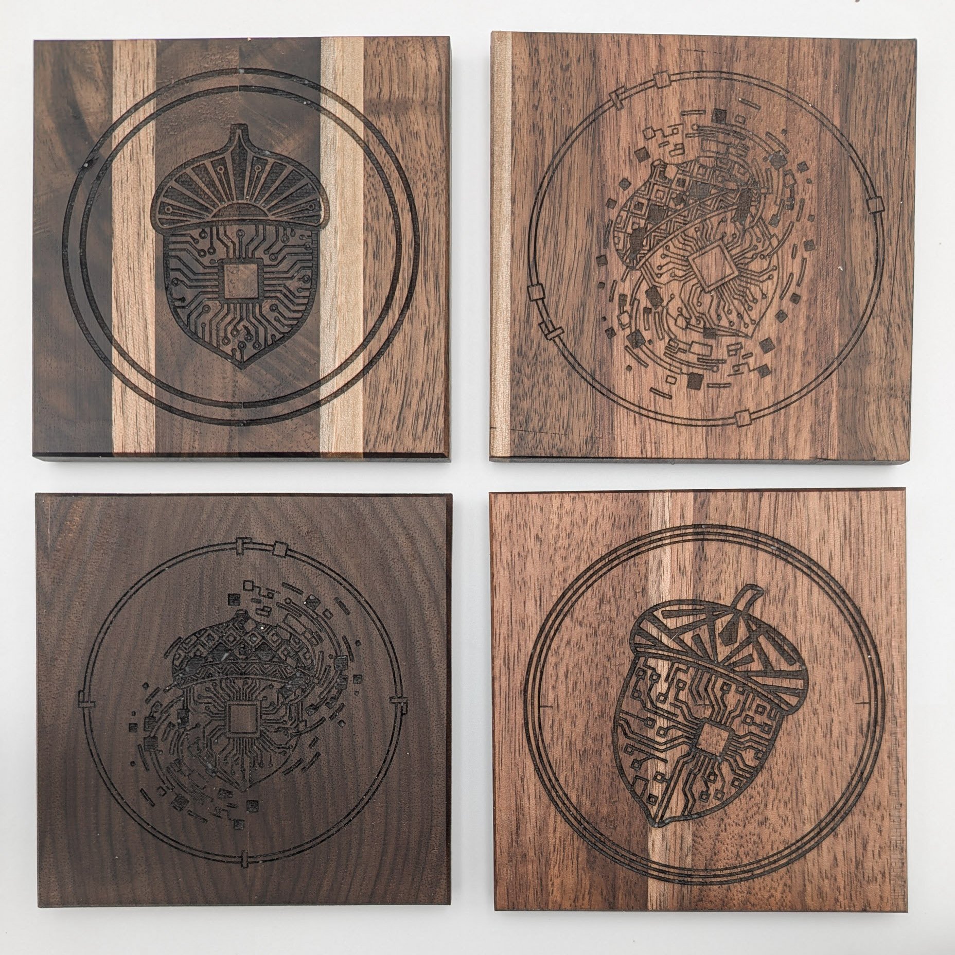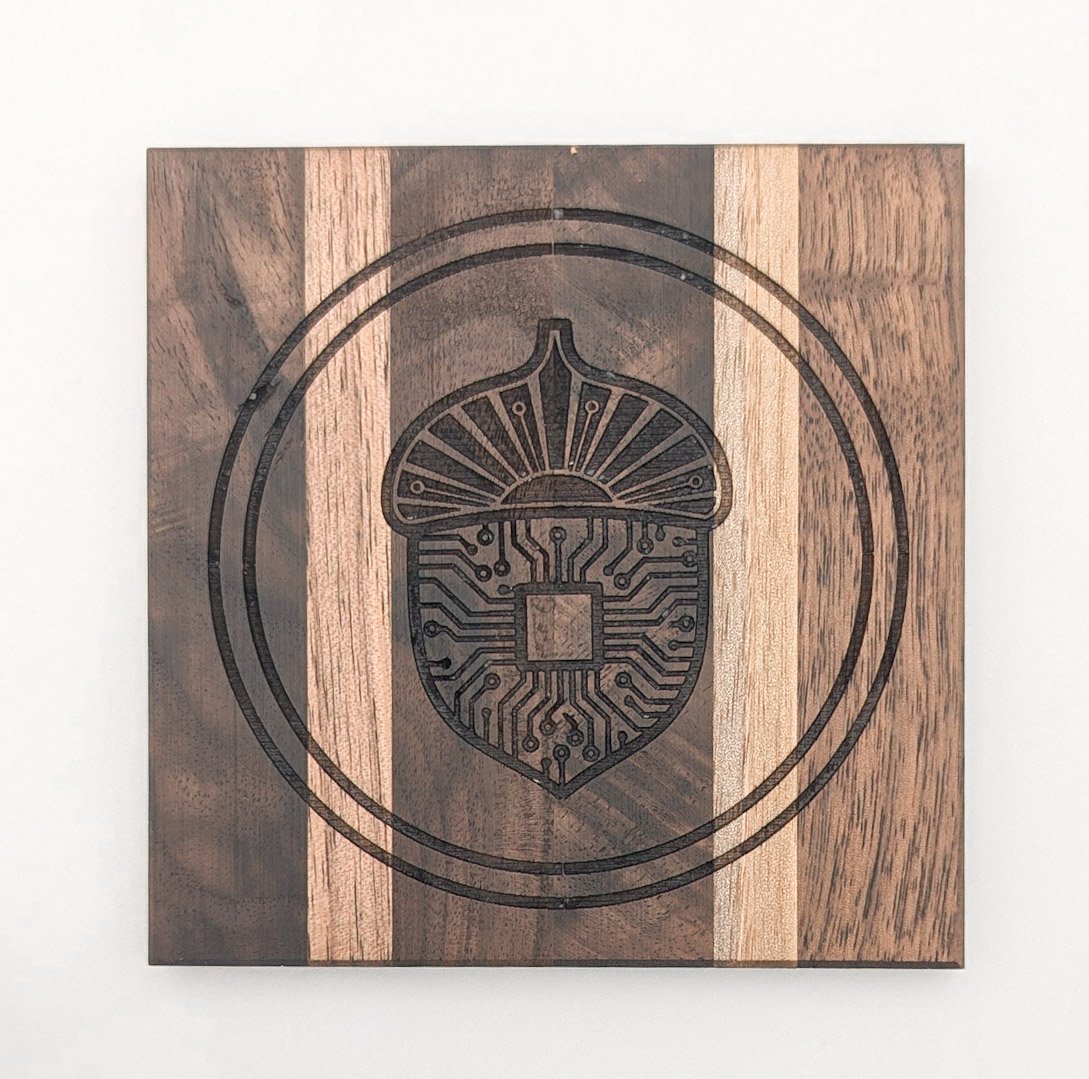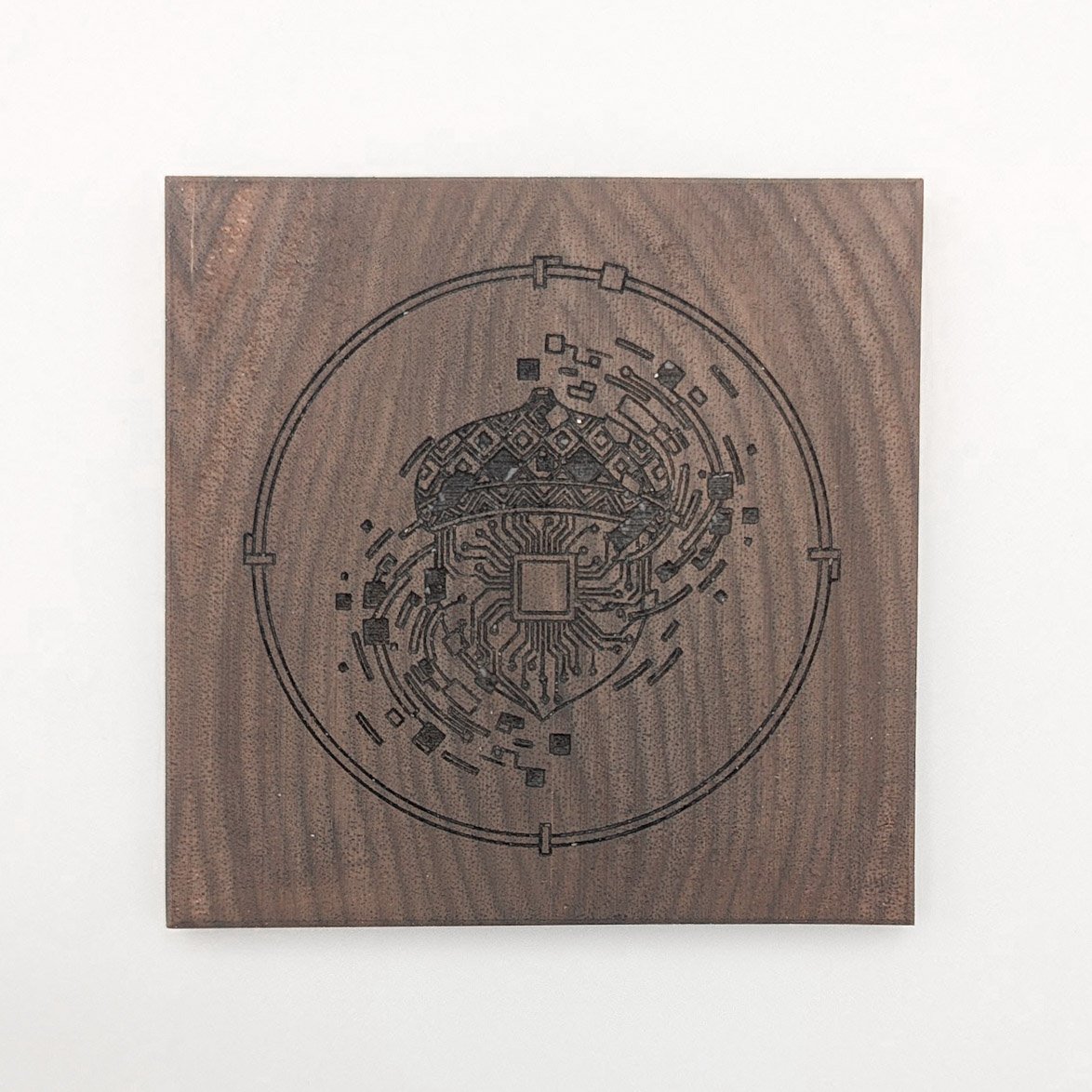 Nature’s potential meets processing power. The humble acorn reimagined with cyberpunk architecture. Handcrafted from Black Walnut with laser-etched circuitry. One-of-a-kind Studio Archive Collection piece. 100mm x 100mm coasters with traditional Japanese finish. Shipping included.