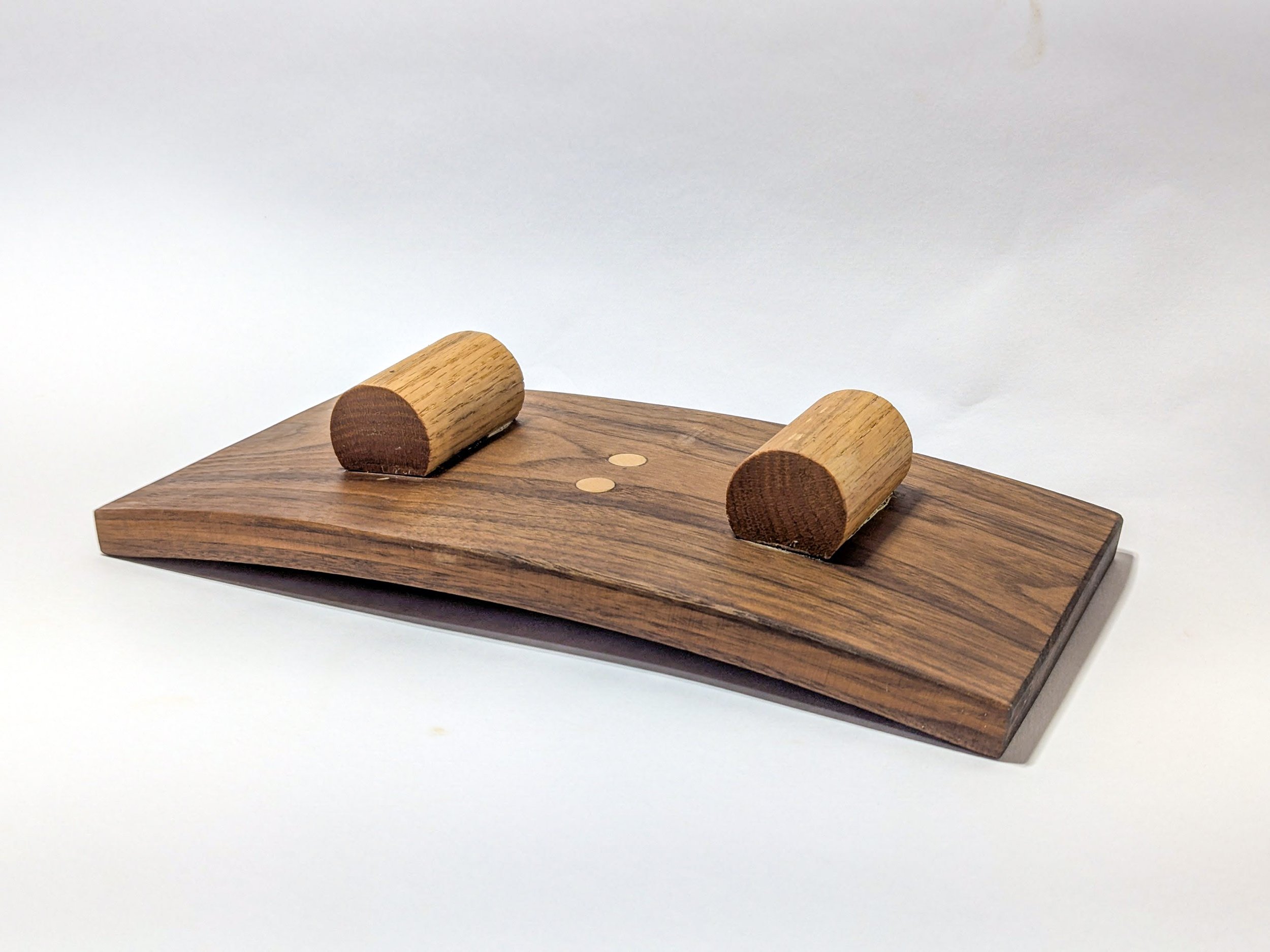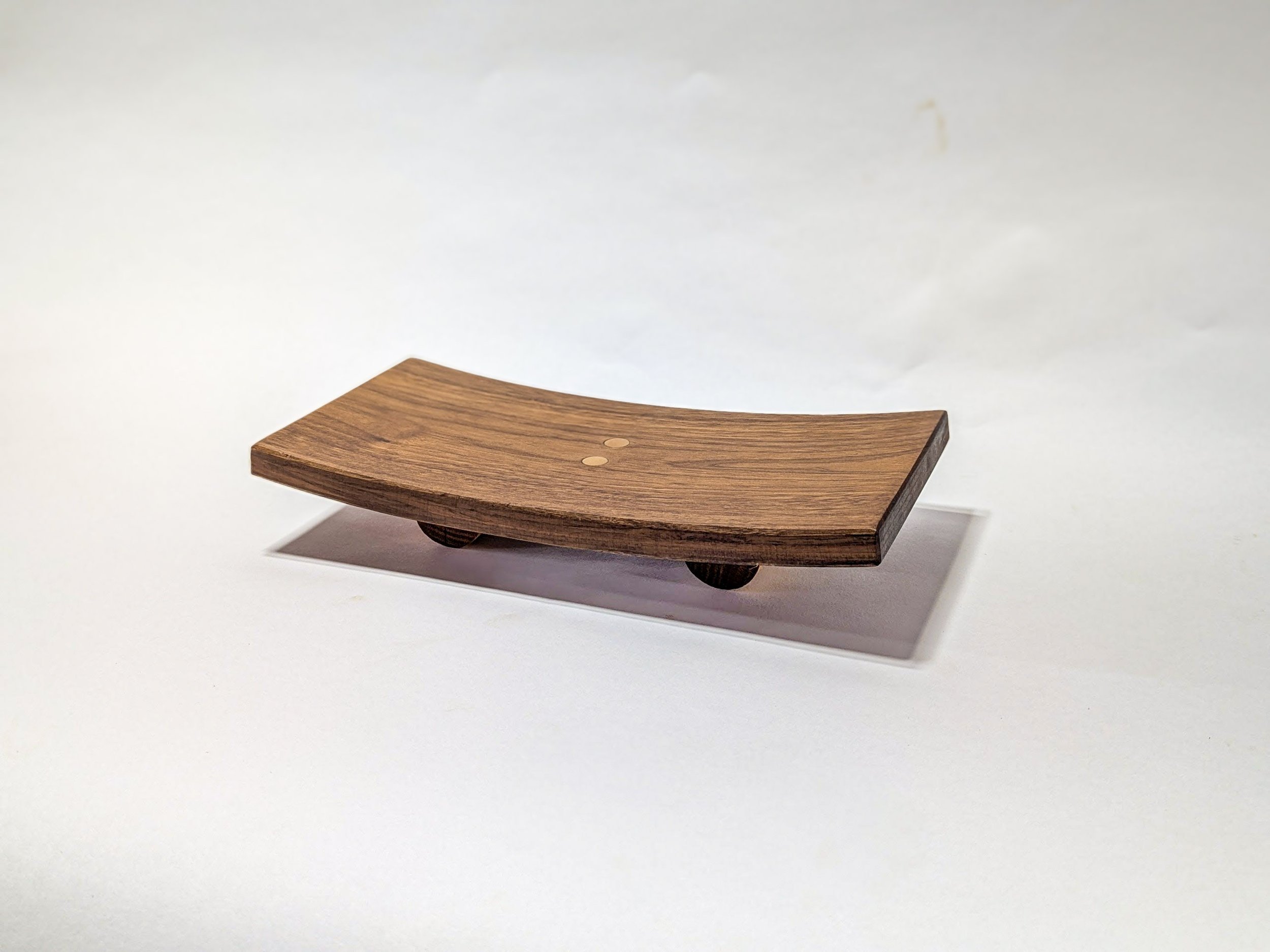 A quiet little piece, made for still moments. Circular-shaped with a bent walnut saddle and rounded oak dowel legs. This bench explores curved, intentional design for meditation practice.