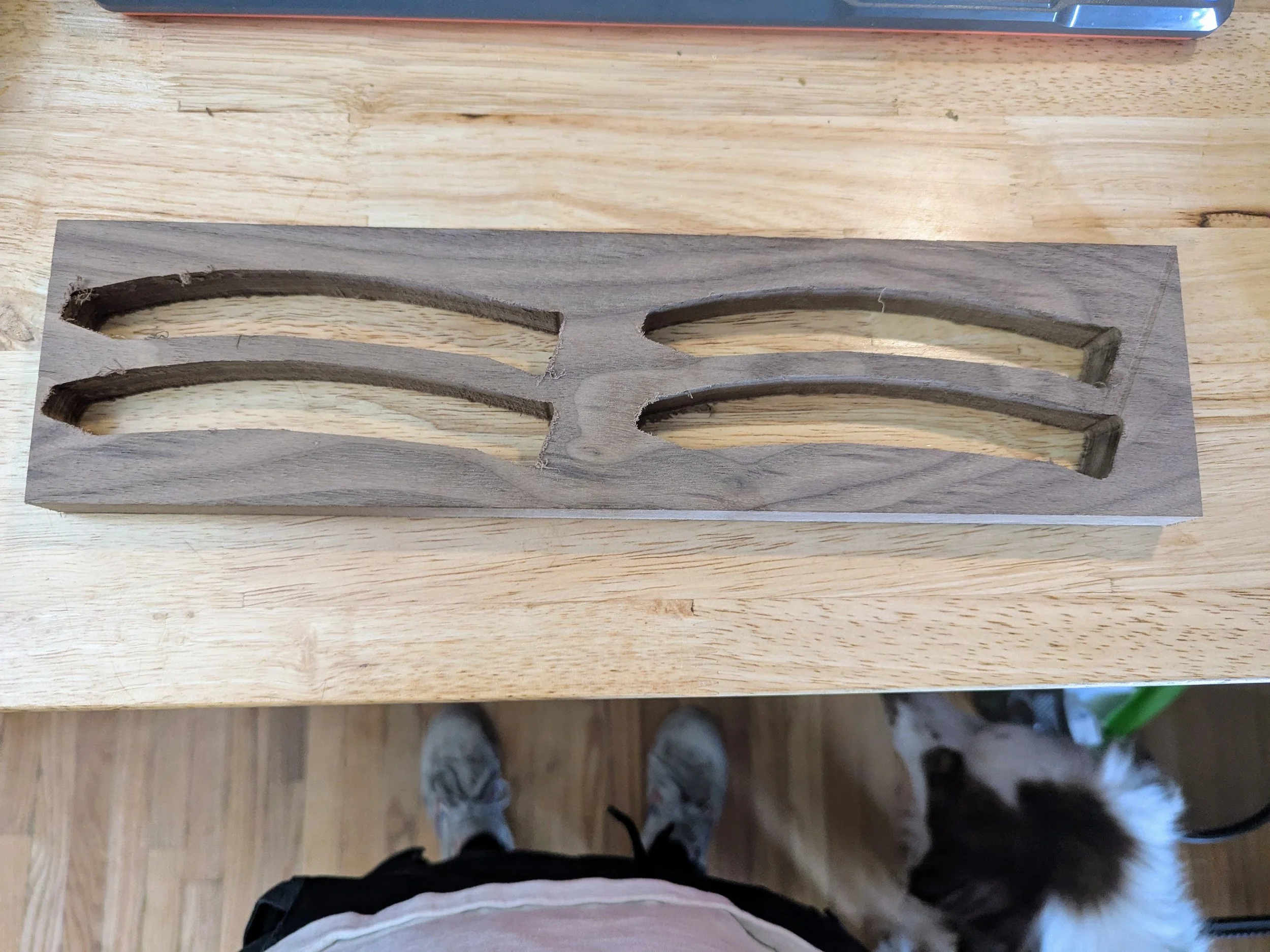 The challenge came from the curves. The bottom drawer, the lower boveda, the upper boveda — even the cupola on top — all demanded precision. Normally, for curves like that you’d bend wood with steam or glue-ups and forms. But here the dimensions landed in that tricky middle ground: not tiny enough to cut easily from solid, not big enough to bend traditionally. So I figured out another way: building up the forms by gluing layers of ¾″ stock. That became the heart of the process. Every piece had to be consistent so the side keels matched the curvature perfectly. No room for error. I leaned on machines for exact symmetry on the sides, but for the top I trusted the eye and the hand. Two different goals, two different tools. The process was: make one perfect piece, then copy it with the router and a template until it was exact.