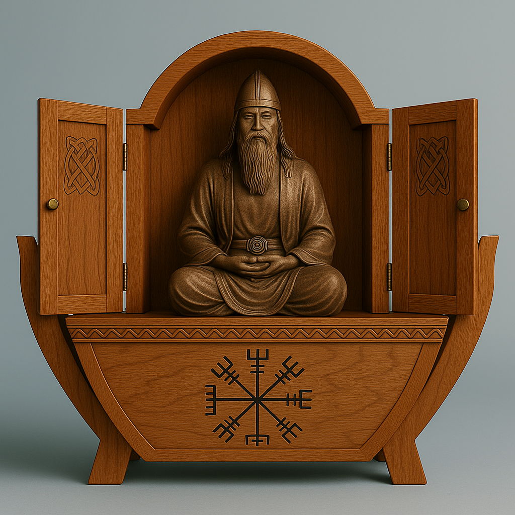 One day Jason told me he wanted an altar for his Odin statue. At first, I misunderstood — I thought he meant a credenza, something to place the statue on top of. But what he really wanted was a home for the statue. A sacred space that would help him shift into the right state of mind for meditation. A piece that would honor his Nordic roots while creating the kind of presence and stillness he was seeking.
